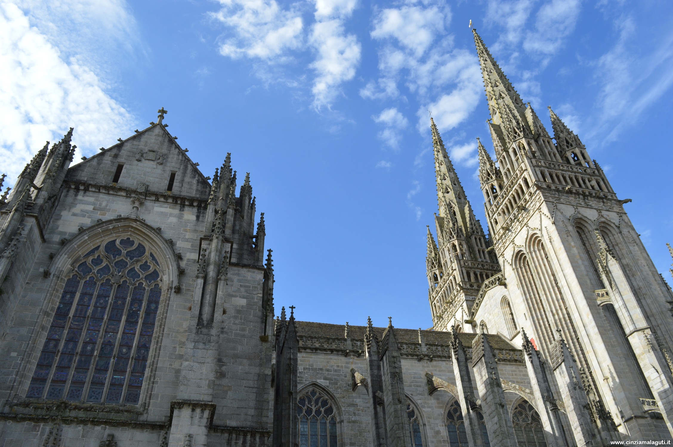 La Cattedrale è dedicata a Saint Corentin ed ha una pianta che, all’altezza della navata, piega leggermente, probabilmente per farla poggiare sulla precedente chiesa romanica per una maggiore stabilità, data la vicina presenza del fiume.