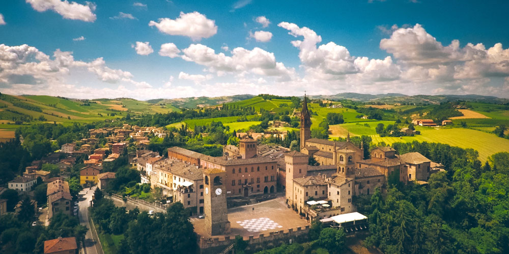 La visita al borgo di Castelvetro di Modena ha il suo cuore nella piazza Roma, un balcone panoramico sulla vallata e le colline; questa piazza è caratterizzata dalla presenza di due imponenti antiche torri, la Torre dell’Orologio e la Torre delle Prigioni, ma anche da un’inconfondibile pavimentazione a scacchiera che, tuttavia, non è antica come le sue torri. Poco distante da Piazza Roma, si erge la sua sobria e graziosa chiesa romanica.