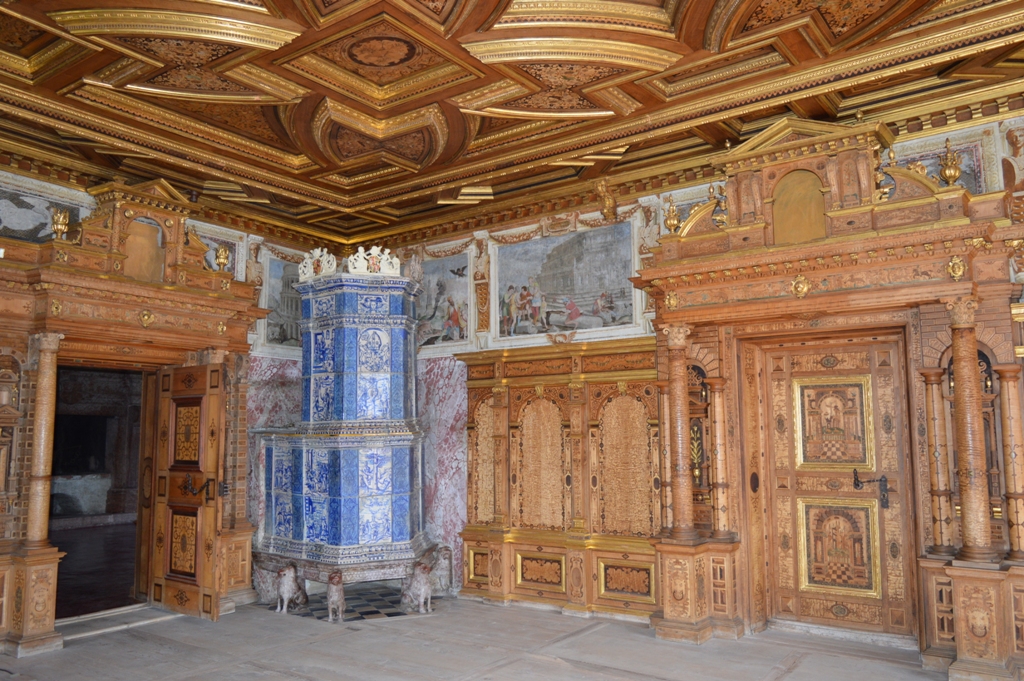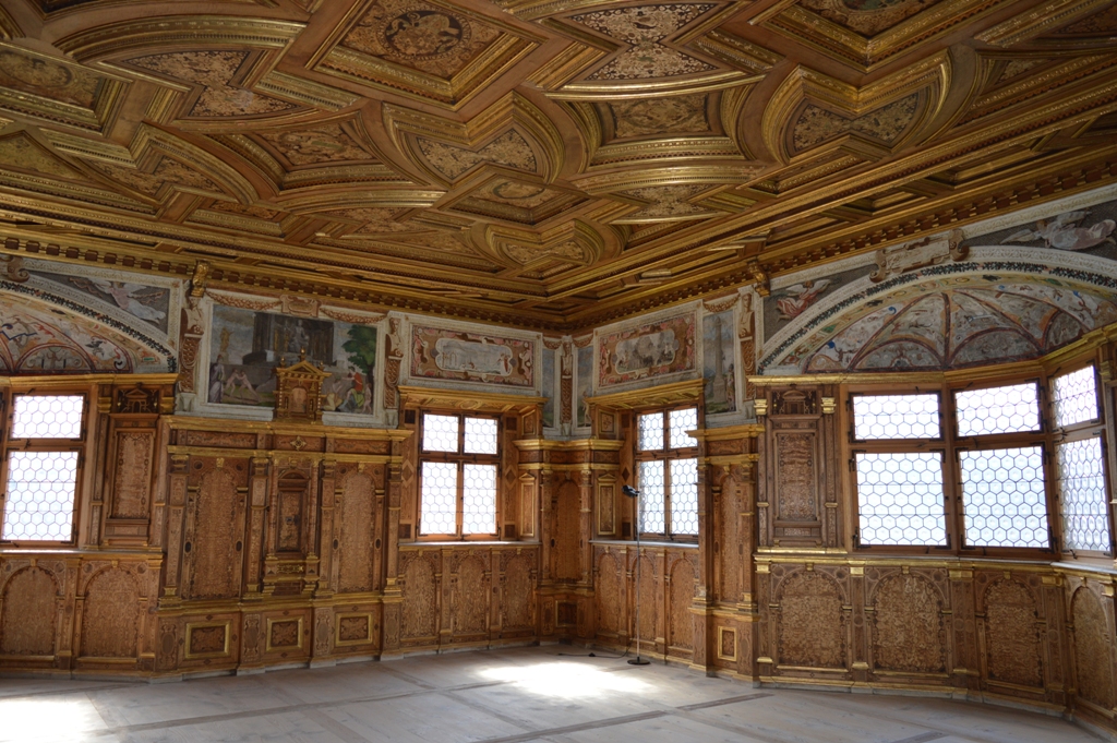Il pezzo forte di Castel Velturno è la Stanza del Principe; è un tesoro inaspettato perché l’esterno di questo palazzo è molto sobrio e mai diresti di trovarvi una tale esibizione di sfarzoso lusso. Tutte le pareti sono rivestite di legni preziosamente e magistralmente intarsiati, utilizzando sette tipi diversi di legni.