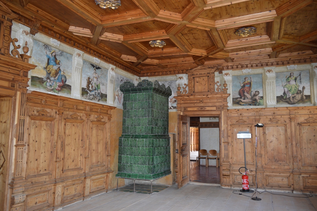 Il suo interno è un tripudio di decorazioni in legno intarsiato di grande pregio, sia alle pareti che al soffitto. I cassettoni che rivestono il soffitto, di quasi tutte le stanze, hanno fini decorazioni di rose lignee dorate. Affreschi che si richiamano alle Sacre Scritture sono presenti in tutte le stanze. Passando dal piano terra al primo piano e, infine, al secondo piano, è un crescendo di sfarzosità che trova il culmine nella Stanza del Principe.