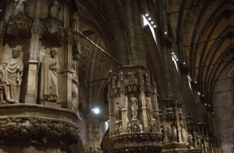 La visita. Il modo migliore per osservare statue e guglie da vicino è salire alle terrazze del Duomo, attraverso apposito ascensore collocato nel transetto. Il Duomo di Milano è l’unica Cattedrale dove si può salire sul tetto. La lunga attesa, tuttavia, potrebbe scoraggiarvi, se avete solo una giornata di tempo da dedicare alla visita di Milano; in questo caso, l’osservazione dal basso dà comunque merito a tanta bellezza. Stesso discorso vale per la visita agli interni del Duomo, ma anche qui potete ovviare ai lunghi tempi d’attesa e vi spiego come. Per entrare in Duomo, ci sono due ingressi, uno riservato ai turisti ed uno per i fedeli; i turisti entrano con biglietto, possono visitare in lungo ed in largo gli interni e fare foto; dall’ingresso per i fedeli si può accedere solo ad una parte della Cattedrale, essendo il resto transennato, e non si possono fare foto; dunque, potete dare un’occhiata agli interni del Duomo di Milano nel breve tratto di passaggio consentito ai fedeli, senza fare fila e senza spendere un euro, ma dovete tenere nello zaino macchina fotografica ed usare un comportamento sobrio e silenzioso.