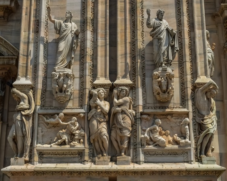 Il Duomo di Milano è una Cattedrale gotica la cui costruzione ebbe inizio nel 1386 per volontà di Gian Galeazzo Visconti e con utilizzo del marmo di Candoglia della cava viscontea in val d’Ossola. Il marmo di Candoglia è di un bel colore bianco/rosa, ma è poroso ed assorbe umidità e polveri; senza continui interventi di pulitura e sostituzioni, il marmo del Duomo di Milano cadrebbe in rovina; troverete sempre qualche impalcatura, proprio perché necessita di una continua manutenzione e sostituzione dei pezzi di marmo più vecchi. Un’altra particolarità che mi preme segnalarti è che le 2300 statue presenti sulle sue facciate, oltre a papi, imperatori e re, raffigurano personaggi della storia, anche recente, come Arturo Toscanini o il pugile Primo Carnera e altre figure curiose, come racchette da tennis, attrezzi da montagna, palle da rugby, una giovane donna di fronte ad un uomo seminudi ed altri che ti lascio scoprire.