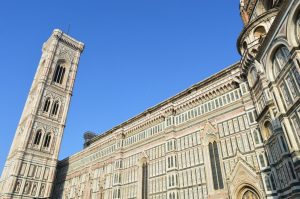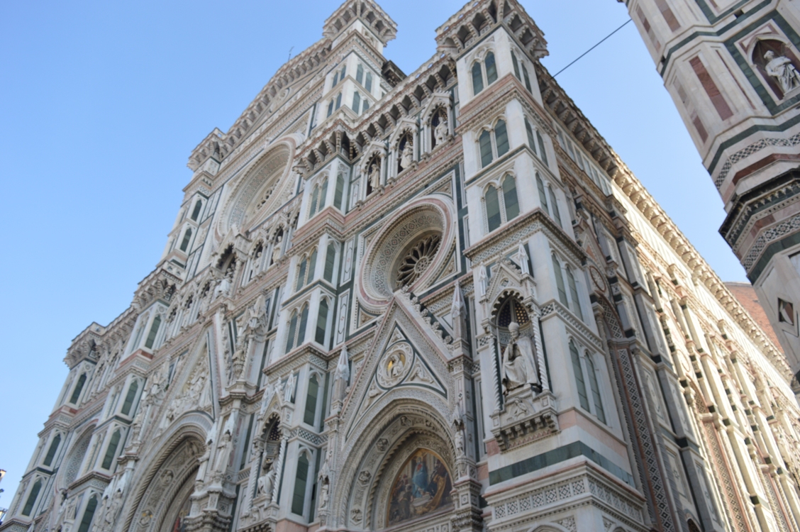 La Cattedrale di Santa Maria del Fiore fu iniziata nel 1296 per sostituire quella di Santa Reparata, ormai troppo piccola per la città, e fu terminata con la costruzione della cupola e della lanterna nel 1471; la facciata è però del 1887, opera di Emilio De Fabris. Accanto alla Cattedrale svetta il Campanile, alto 85 metri, progettato da Giotto nel 1334, continuato alla sua morte da Andrea Pisano e terminato da Francesco Talenti nel 1359.