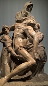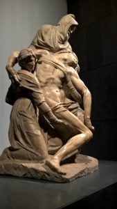 Poco più avanti grandeggia la Pietà di Michelangelo che raffigura una Deposizione di Cristo; il volto di Nicodemo è un autoritratto del maestro; Michelangelo iniziò questa sua grande opera nel 1547-50 come ornamento per la propria tomba, ma poi l’abbandonò e cercò di distruggerla a martellate, irritato per i difetti del blocco di marmo, l’opera appare così incompiuta e lo si nota bene girandoci attorno.