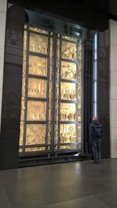 Subito dopo l’ingresso, uno scenografico allestimento rievoca la piazza tra Cattedrale e Battistero; su una parete sono collocate 40 delle sculture che ornavano l’esterno della Cattedrale, com’erano disposte all’origine, mentre sulla parete opposta sono incastonate le tre porte bronzee del Battistero, sormontate dai gruppi scultorei originali: la porta Nord e quella del Paradiso, capolavori di Lorenzo Ghiberti e quella di Andrea Pisano, ancora in restauro e, per ora, sostituita da una riproduzione fotografica. La porta più bella, quella del Paradiso, riproduce le Storie dell’Antico Testamento in dieci formelle in bronzo dorato. Questa sala è stata ricavata nell’ex teatro settecentesco degli Intrepidi, trasformato in garage nel Novecento e acquistato dall’Opera nel 1998. L’allestimento permette di ammirare le statue dall’angolazione originaria, da sotto in su, e nel loro originale contesto corale.
