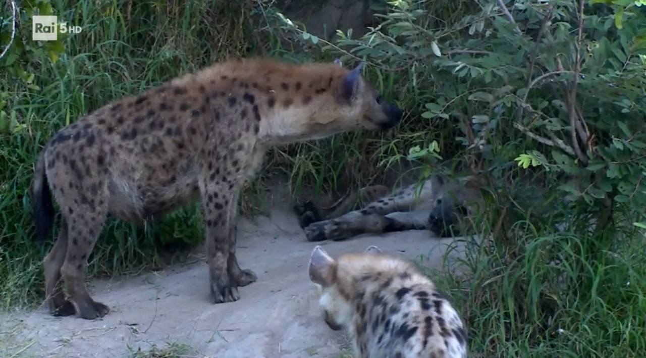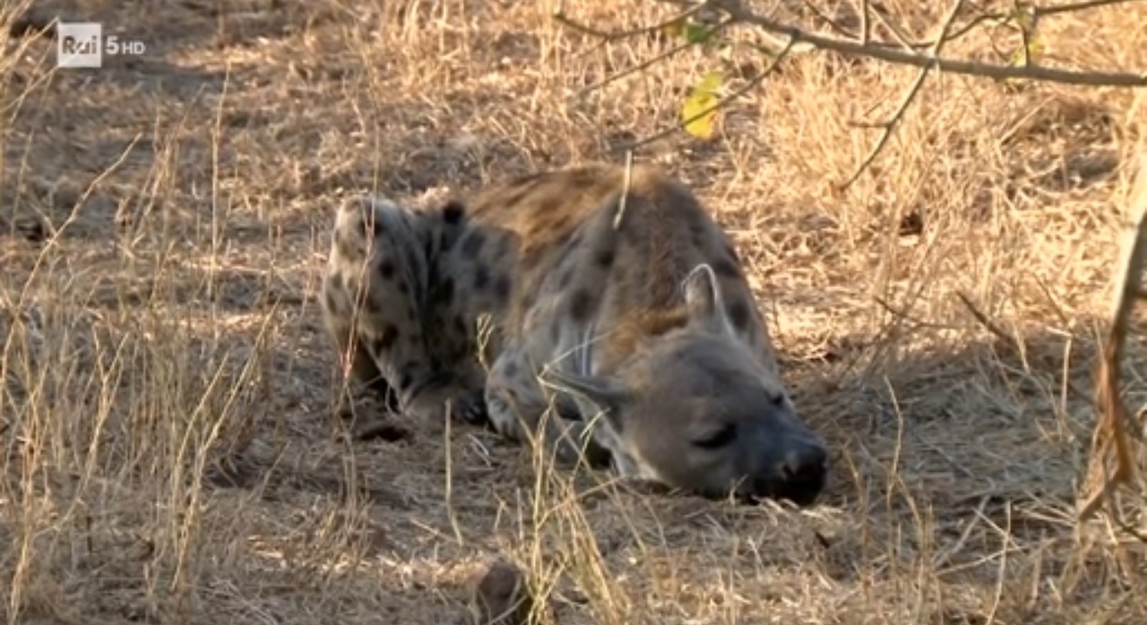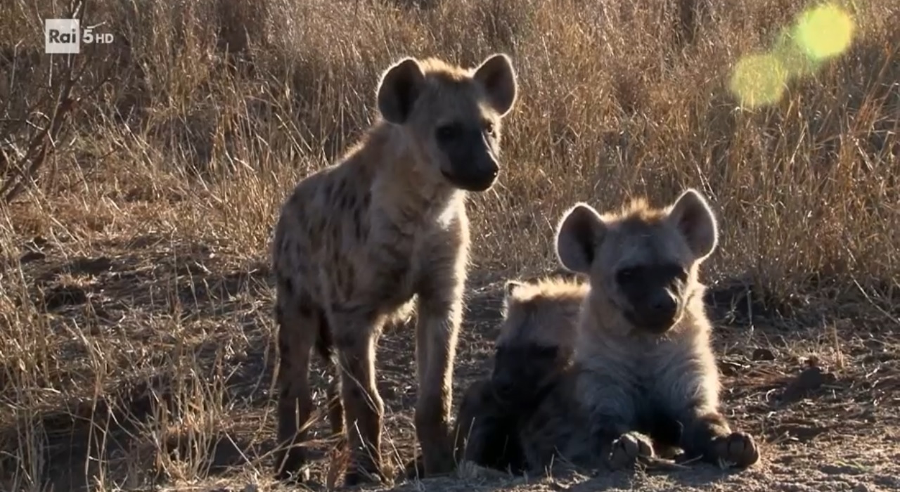 La iena maculata o ridens è un carnivoro sociale organizzato in clan matriarcali costituiti da più femmine con i loro piccoli e dove i maschi entrano solo in periodo di riproduzione; a differenza di altre specie, le femmine di questo tipo di iena allattano solo i propri cuccioli. Le iene partoriscono in qualsiasi periodo dell’anno ed i piccoli restano nella tana fino a più di un anno di età, questo spiega la presenza nei clan di individui di diversa età. Le iene maculate, caratterizzate dal loro mantello macchiato, sono dotate di grande resistenza e di un efficace olfatto che permette loro di sentire l’odore del sangue anche da molto lontano; anche l’udito è buono ed utile anche per sentire il trambusto dei branchi, spesso indice di buone prospettive alimentari. Le iene sono gli spazzini delle praterie visto che mangiano anche le ossa delle prede, importanti fonti di sali minerali, per loro.