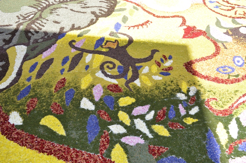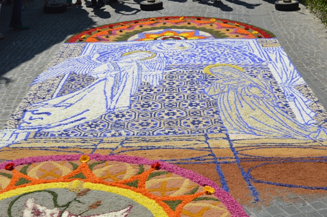 Tappeti e quadri floreali a pavimento così fatti abbelliscono la via principale del centro storico di Spello e la loro funzione tradizionale è quella di rendere onore al passaggio del vescovo e della processione del giorno del Corpus Domini. Al termine della processione rimangono solo forme scomposte di quelle meravigliose realizzazioni floreali; d’altra parte, dopo quel passaggio, esse hanno terminato la loro funzione.