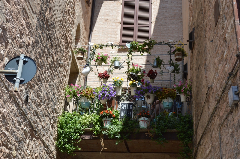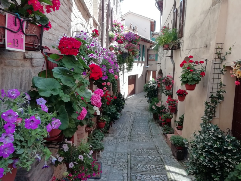 Ora alcune note sul borgo di Spello. Spello è collocato in posizione collinare nella provincia di Perugia, in Umbria. E’ un borgo medievale da scoprire percorrendo i suoi graziosi vicoli ed i suoi affacci panoramici. Fondata dagli Umbri, poi colonizzata dai Romani, Spello conserva tracce dell’antico Foro e delle mura difensive. Non manca di chiese, ma quella più importante è la Collegiata di Santa Maria Maggiore che custodisce affreschi del Cinquecento realizzati da Pinturicchio.