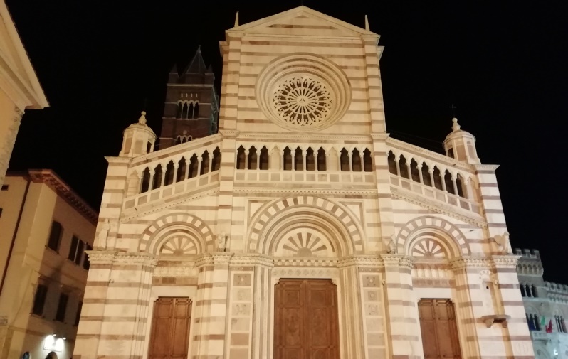 Faccio di Grosseto solo alcuni cenni perché ho avuto modo di visitarla solo durante una breve escursione serale. Due sono le piazze centrali, una affiancata all’altra: Piazza Duomo e Piazza Dante. In Piazza Duomo si trova la Cattedrale di San Lorenzo, edificata tra la fine del XIII secolo e l’inizio del XIV secolo, ma la facciata attuale venne eseguita nell’Ottocento in bicromia bianco-rossa e forme goticheggianti. In Piazza Dante si trova un palazzo che non mancherà di catturare la tua attenzione, si tratta del Palazzo Aldobrandeschi; questo palazzo ha una pianta poligonale, è in stile neogotico e fu costruito nei primissimi anni del Novecento al posto dell’antico Palazzo Pretorio; Palazzo Aldobrandeschi è sede degli uffici della Provincia di Grosseto. Intorno al centro storico è presente una cinta muraria in ottimo stato di conservazione; essa è il risultato degli interventi sulla cinta medievale operati prima dai Senesi, poi da Medici, poi dai Lorena.