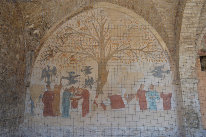 Nel 1999, durante il restauro del palazzo, un tempo utilizzato come Granaio, costruito sull’antica Fonte dell’Abbondanza (fonte pubblica di acqua), fu rinvenuto un affresco, proprio sulla parete frontale della Fonte, oltre un’arcata di accesso; l’affresco raffigura un rigoglioso albero con … dei frutti molto particolari; quando fu rinvenuto, detto affresco portava mele, ma i restauratori si resero subito conto che il disegno delle mele non era originale e serviva a nascondere qualcosa d’altro; cosa? tanti falli! Sì, dietro ad ogni mela c’e un fallo eretto e fu così che venne chiamato l’Albero della Fecondità, ma lo stupore non finisce qui: sotto l’albero, due donne si accapigliano nel contendersi uno dei falli, un’altra cerca di smuovere l’albero per farne cadere uno, ci sono anche corvi neri. Ancora oggi questo affresco fa discutere e diverse sono le ipotesi sul significato; una delle interpretazioni, quella che mi sembra più realistica, gli assegna una funzione apotropaica, ossia di buon augurio per i raccolti affinché fossero sempre abbondanti (granaio) e l’acqua sempre disponibile (fonte). L’affresco dell’Albero della Fecondità si trova in centro storico, a due passi dalla Cattedrale di San Cerbone, prima dell’ingresso nella bella Piazza Garibaldi.