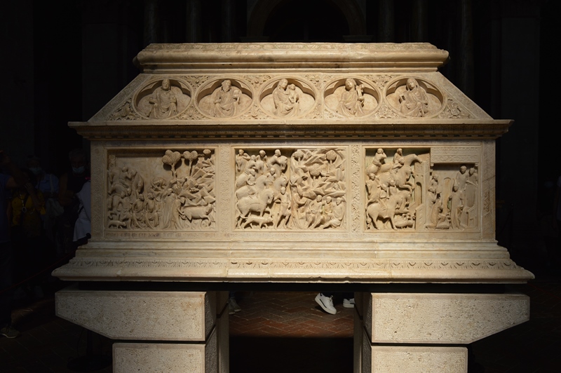 Piazza Garibaldi è, dunque, luogo e simbolo del periodo del Libero Comune e la sua Cattedrale, voluta dal Vescovo e la cui costruzione iniziò nel periodo antecedente (XI secolo), venne ultimata nel XIV secolo. La Cattedrale di Massa Marittima è dedicata a San Cerbone; è il patrono e lo riconoscerai nelle raffigurazioni all’interno della Chiesa perché viene sempre rappresentato con delle oche. La Cattedrale di San Cerbone è imponente, è posta su una scalinata in travertino, così come del luminoso travertino sono fatte le sue mura; è in stile romanico, tranne l’abside che venne costruito per ultimo, quando lo stile architettonico era già il gotico; gli interni sono molto interessanti perché custodiscono 3 capolavori: una fonte battesimale marmorea duecentesca illustrata dotata di un tempietto quattrocentesco, il sarcofago di San Cerbone in marmo con scolpite vignette che ricordano i suoi miracoli e la Maestà che è una pregevole pittura su legno del 1316 attribuita a Duccio di Buoninsegna (ma non è firmata).