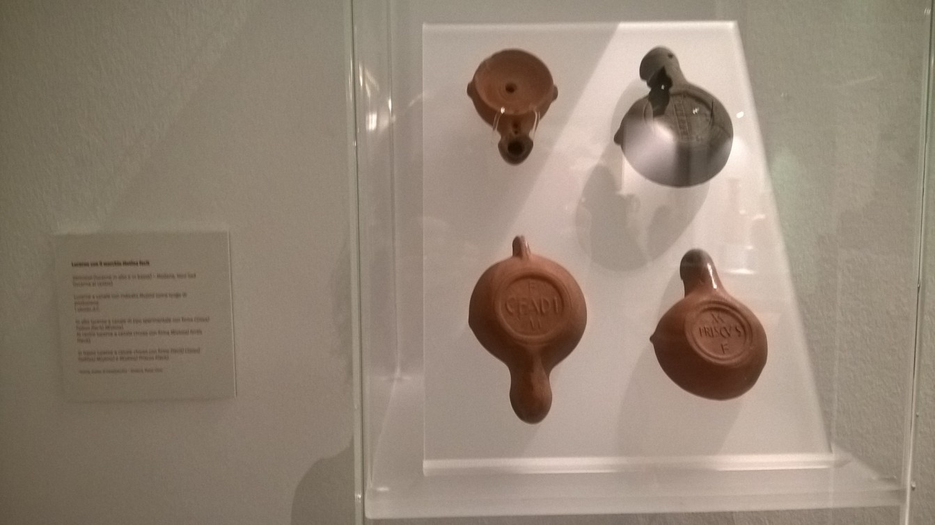 Le attività. L’inserimento di Mutina nei grandi circuiti commerciali è attestato a partire dalla metà del II secolo a.C., quando cominciarono a comparire le anfore che trasportavano vino. Gli scambi resero Mutina molto attiva nella produzione di ceramiche, soprattutto lucerne, sulle quali era a volte indicato, a garanzia della qualità, il luogo di produzione accanto al nome del produttore; sono stati rinvenuti reperti con l’iscrizione Mutina Priscus F(ecit) e M(utina) Fortis F(ecit); Fortis è da annoverare tra i maggiori produttori e le sue lucerne furono commercializzate in gran parte del mondo romano. Produzione fittile, ma anche di vino e di lane pregiate, resero Mutina famosa per la laboriosità che ancora oggi produce eccellenze.